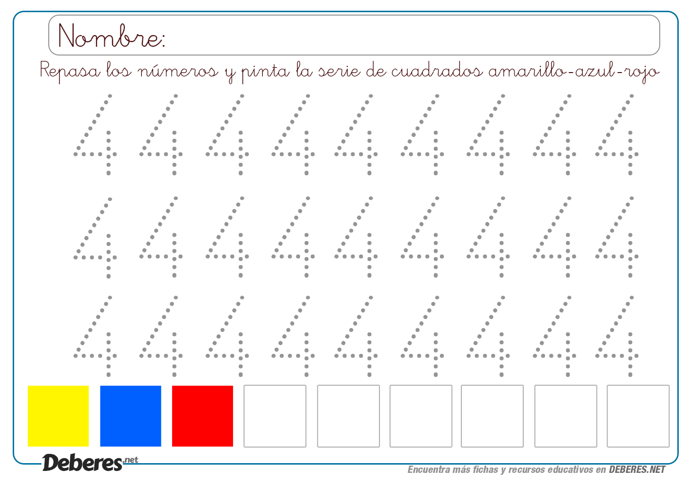 Ficha para repasar el numero 4 con puntitos y hacer series de colores