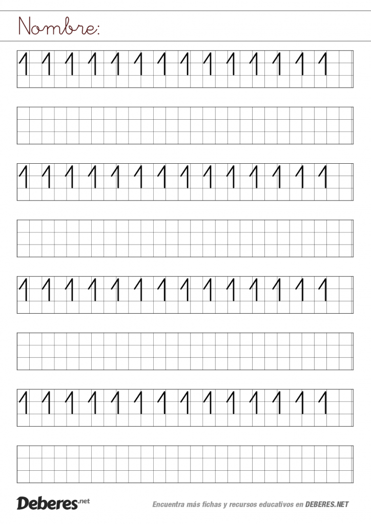 Colección de fichas de grafomotricidad del número uno para niños y niñas de primaria.
