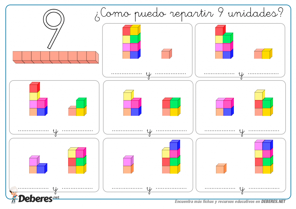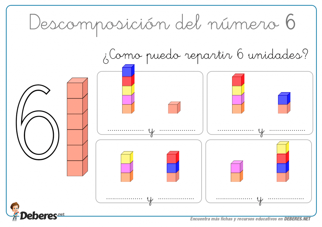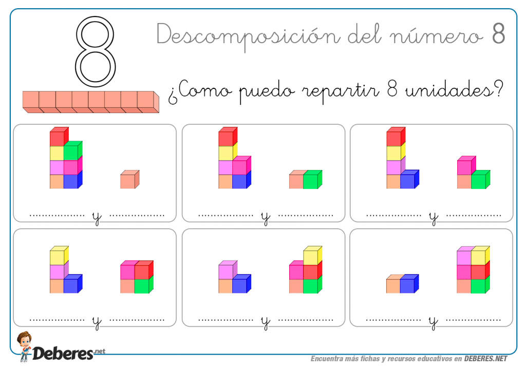 Las siguientes fichas son ejercicios para que el niño descomponga en numeros más pequeños apoyados por imagens de cubos.