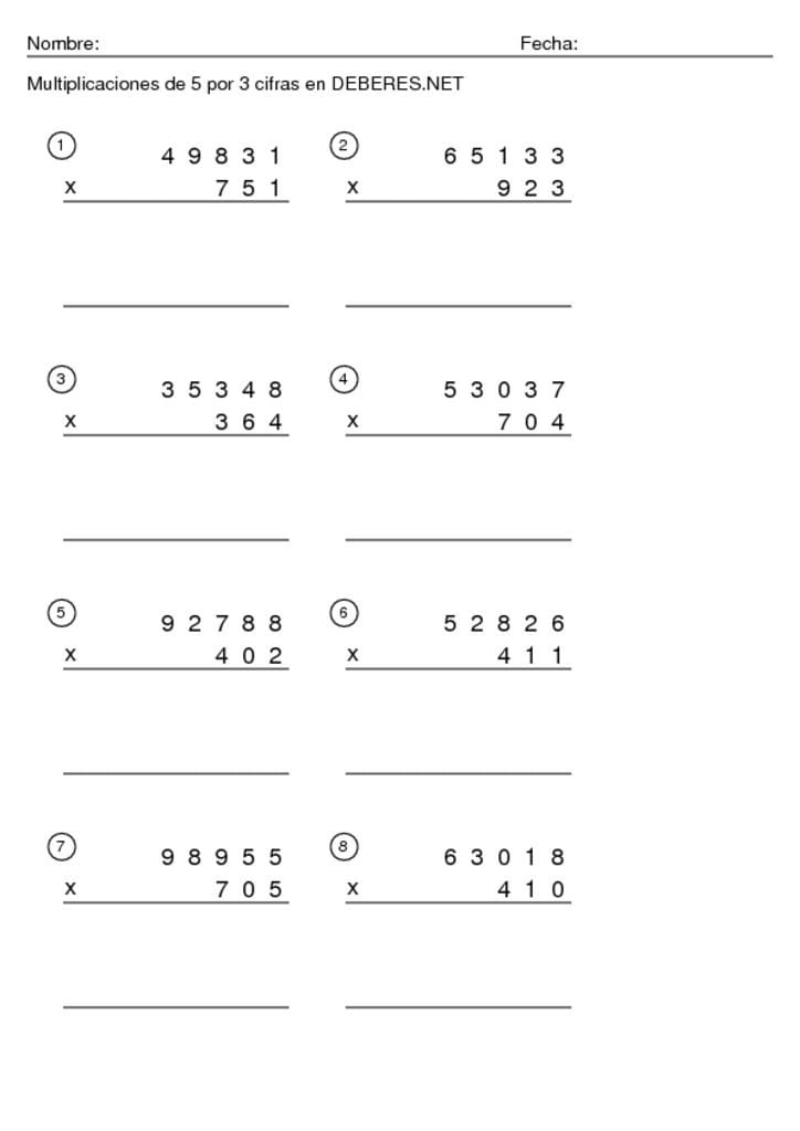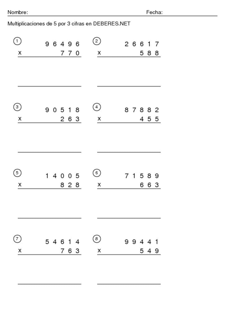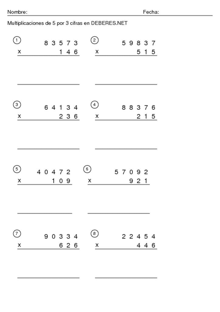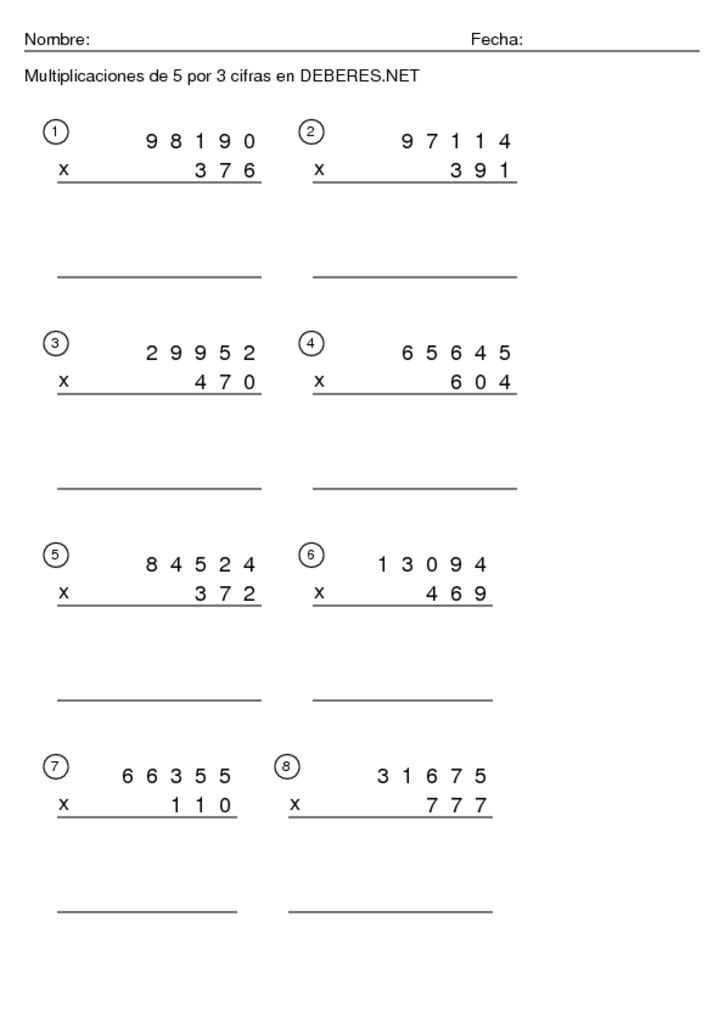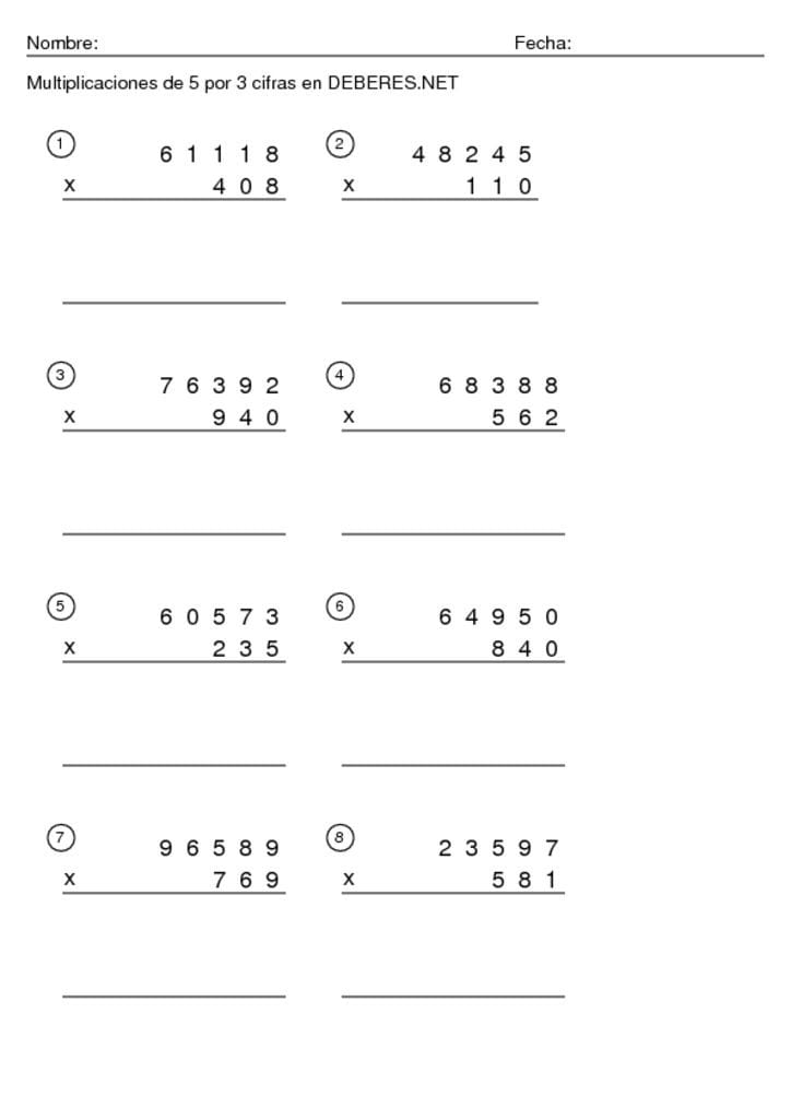 Fichas Multiplicaciones de 5 cifras por 3 cifras