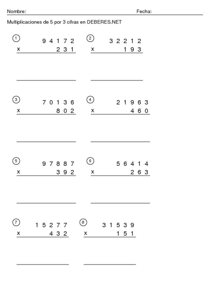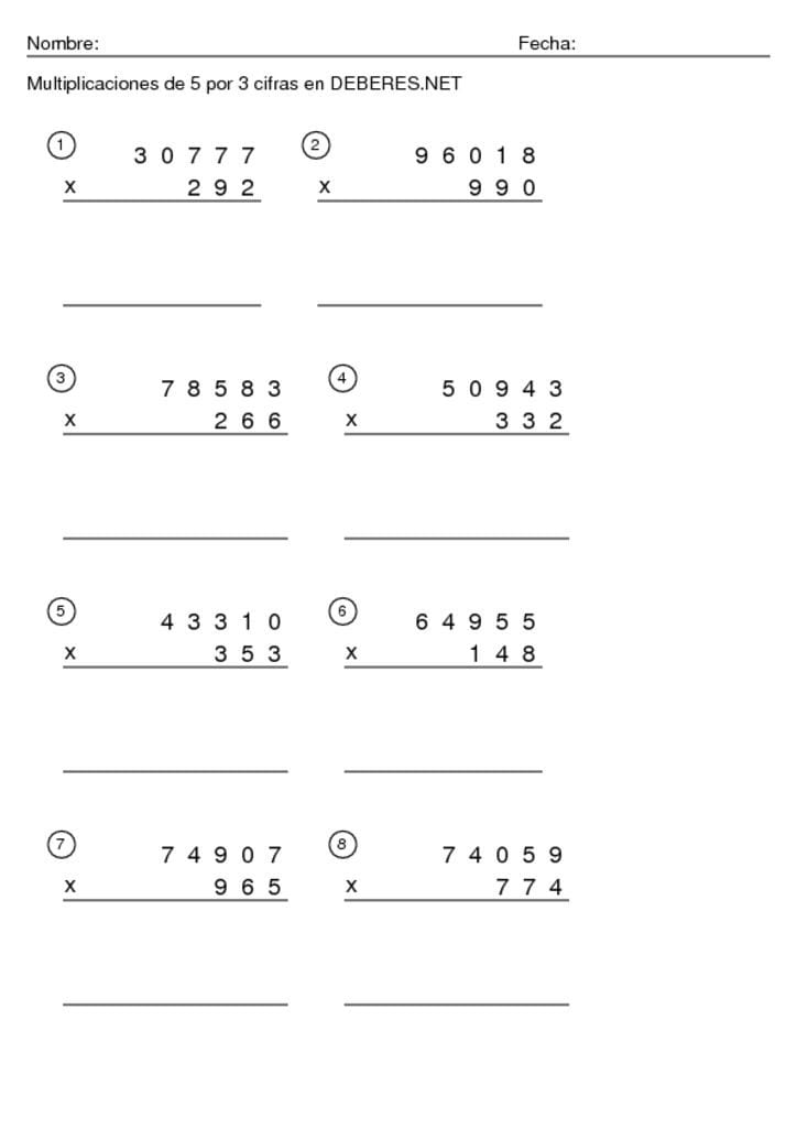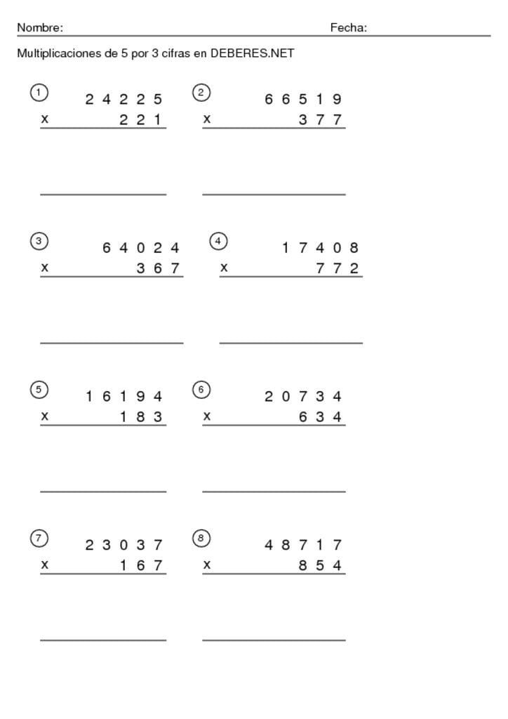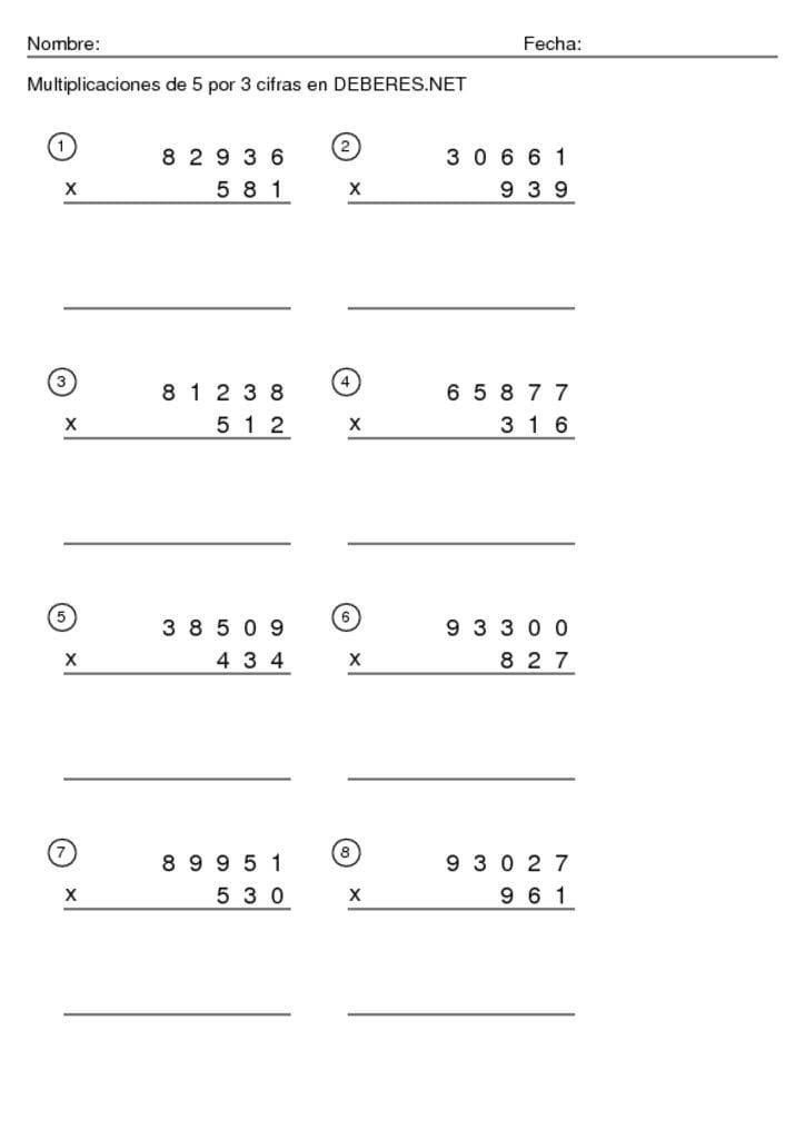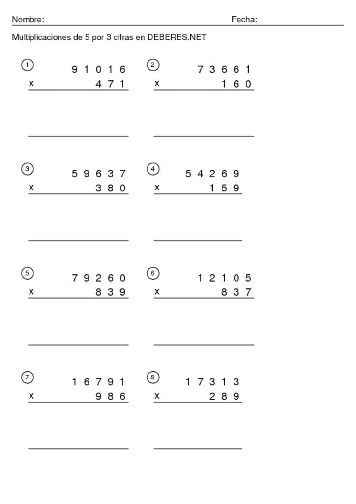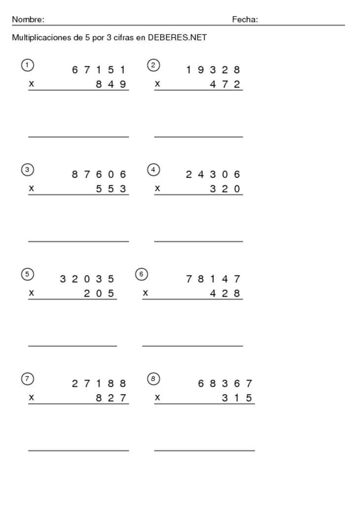 Fichas Multiplicaciones de 5 cifras por 3 cifras