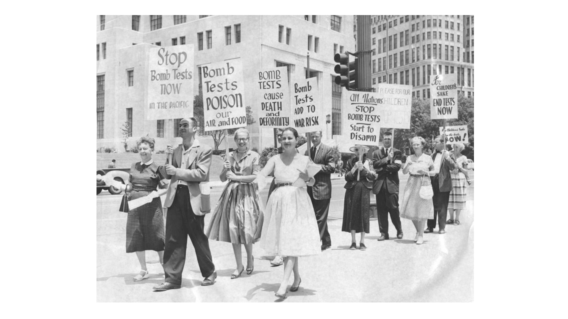 Una fotografía de los miembros de la Acción No Violenta contra las Armas Nucleares haciendo un piquete en el centro de Los Ángeles el 5 de junio de 1958.