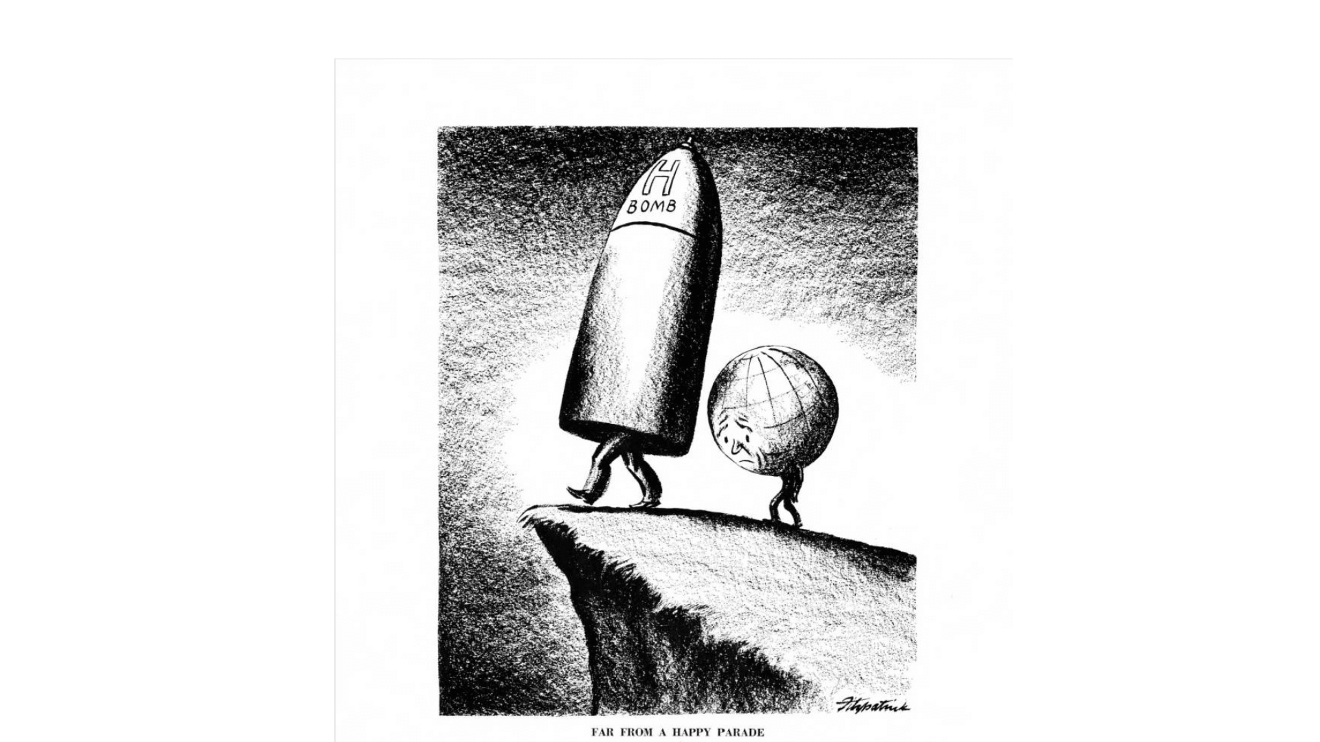 Una caricatura de 1953 de una bomba de hidrógeno que lleva a la Tierra al borde de un acantilado.