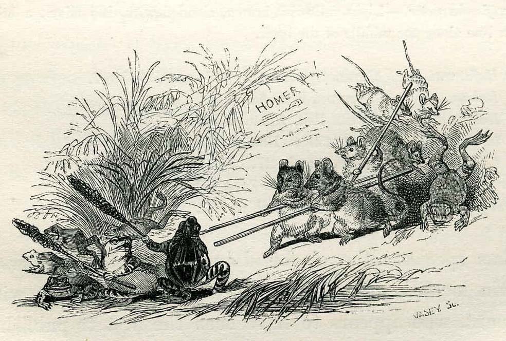 Y como muchas veces los más graves sucesos encuentran su origen en los más risueños episodios, he aquí el feliz inicio de este delicioso poema cómico, llamado La Batracomiomaquia en el que se narra la descomunal batalla entre ratones y ranas.