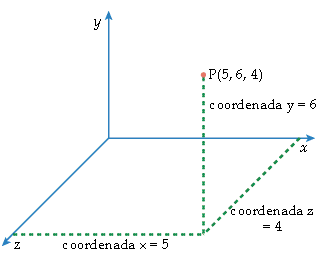 Las coordenadas de un punto en un espacio tridimensional constan de tres números, la coordenada x, la coordenada y, y la distancia al origen medida sobre el eje z, la coordenada z. Por ejemplo, el punto P del diagrama tiene las coordenadas (5, 6, 4).