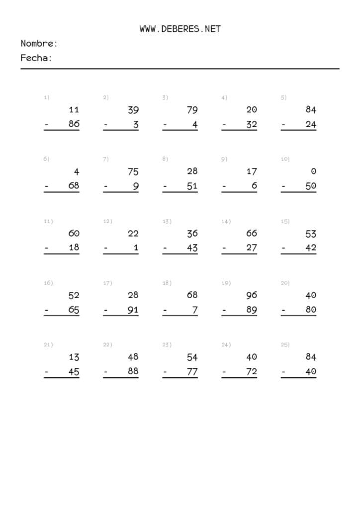 Restas con resultado negativo. Fichas para descargar e imprimir con cientos de fichas y miles de operaciones de Restas con resultado menor de 0, es decir, restas con resultado negativo.