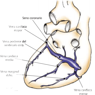 • La vena cardíaca mayor: se origina en la punta del corazón y asciende acompañando a la arteria descendente anterior y a la circunfleja para desembocar en el borde izquierdo del seno coronario. A lo largo de su recorrido recibe a la vena marginal izquierda y a la vena posterior del ventrículo izquierdo.