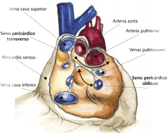 El seno transverso de Theile se situa detrás de la aorta y el tronco pulmonar, que tienen una cubierta común de pericardio visceral. Forma un “túnel” que comunica a ambos lados con la cavidad pe- ricárdica. Su límite anterior y techo lo forman la aorta y la arteria pulmonar y su límite posteroinferior, la vena cava superior y las aurículas.