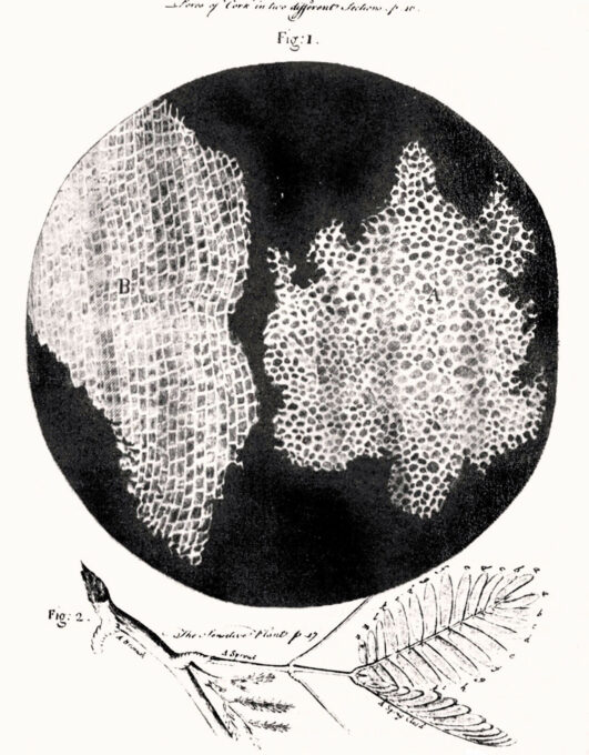 Cuando miró una fina rebanada de corcho bajo su microscopio, se sorprendió al ver lo que parecía un panal. Hooke hizo el dibujo en la figura de abajo para mostrar lo que vio. Como puede ver, el corcho estaba compuesto de muchas unidades diminutas, que Hooke llamó células.