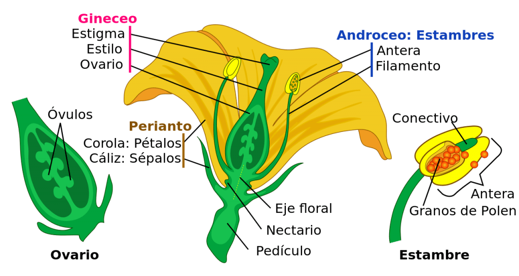 Las flores contienen un cierto numero de filamentos denominados pistilos y estambres y que constituyen los órganos reproductores de la planta, siendo los pistilos los órganos femeninos y los estambres, los masculinos.