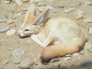 El fenec, o zorro del desierto vive en las regiones más calurosas y secas de Africa, Arabia y el Sinaí. Se trata del zorro de menor tamaño y mayores orejas. Estas son muy sensibles, ya que al estar escasas las presas, debe oir muy bien para encontrarlas. Se cree también que su gran tamaño se debe a su adaptación a la vida en un clima muy caluroso y seco y a que actúan como radiadores, permitiendo que el animal pierda calor. Por el contrario, el zorro ártico, habitante del Polo Norte, tiene unas orejas muy pequeñas y ocultas entre su pelaje. Esto lo protege contra la pérdida de calor. El fenec mide de 35 a 40 centímetros y solamente sus orejas, 15 centímetros. Se alimenta de escorpiones e insectos que busca en agujeros y otros mamíferos, a los que mata de un rápido mordisco en el cuello. Es carnívoro y, mediante la absorción de los líquidos contenidos por el cuerpo de sus víctimas, consigue suficiente agua para sobrevivir.Además, evita la canícula del día ocultándose en su madriguera.