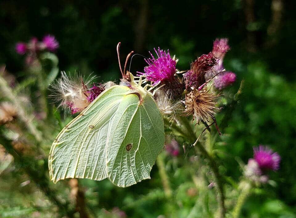 la Limonera {Gonepteryx rhamni) debe su nombre al color amarillo del macho, que tiene un punto rojo en cada ala. La metamórfosos es un aspecto tipico de las mariposas: la eclosión del huevo en forma de oruga.