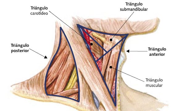 Este triángulo se encuentra dividido por el hueso hioides y los músculos digástrico y omohioideo, formando a su vez los triángulos submandibular, carotídeo, muscular y submentoniano.