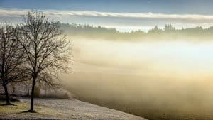 auténtico paisaje invernal. Los árboles no tienen hojas, ya que las perdieron en el otoño. El suelo está cubierto por una ligera capa de nieve.