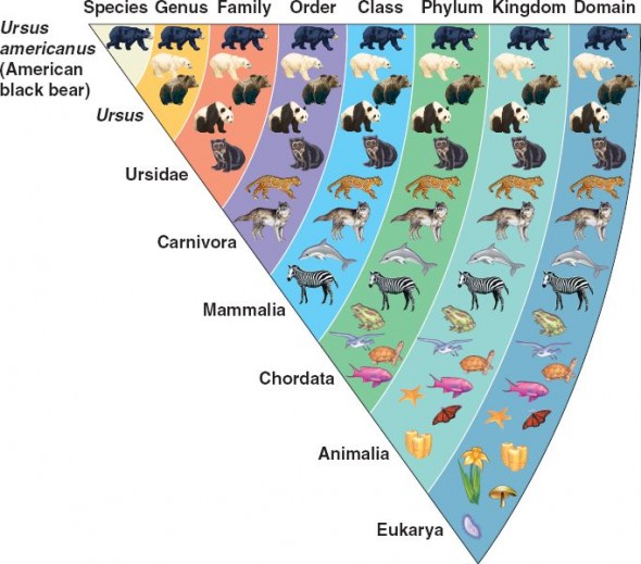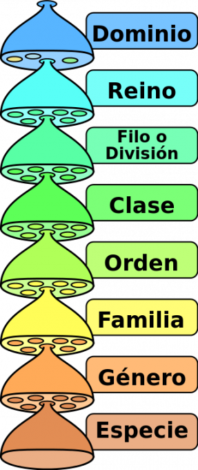 Cada especie pertenece a un género y éste a una familia, que a su vez se incluye en un orden, situado en una clase, que se engloba en un tipo. Éstos se agrupan en reinos.