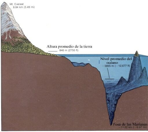 El relieve submarino es tanto más accidentado que el continental. La fosa marina más profunda de las conocidas se halla situada en las proximidades de las islas Filipinas. Alcanza los 11.520 m de profundidad. El Everest, la montaña más alta de la tierra, con sus 8840 m, cabría fácilmente en ella.