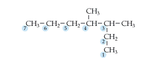 La numeración de la cadena empieza en el extremo que proporcionará el menor número al grupo anexo. Así, los átomos de carbono se numeran como en el siguiente ejemplo.