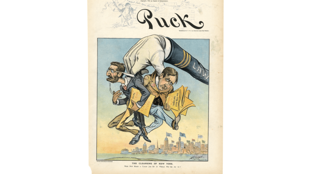 La portada de un número de la revista satírica Puck con una ilustración titulada «La limpieza de Nueva York», 1900.