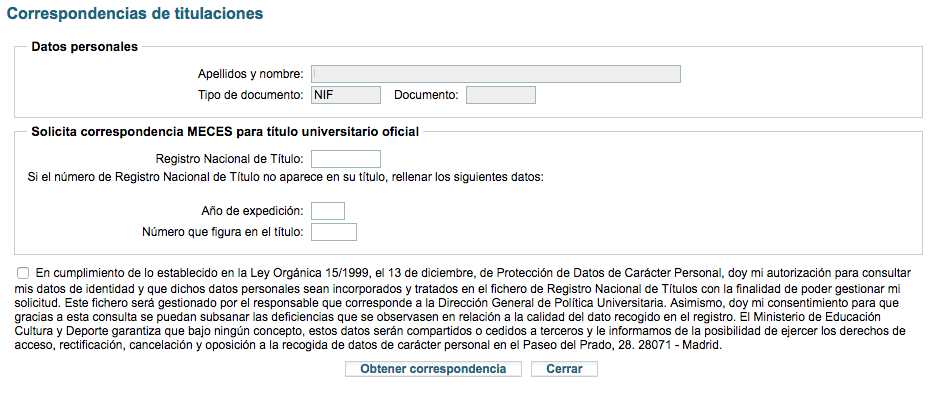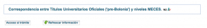 Página de Correspondencia entre Títulos Universitarios Oficiales (‘pre-Bolonia’) y niveles MECES.